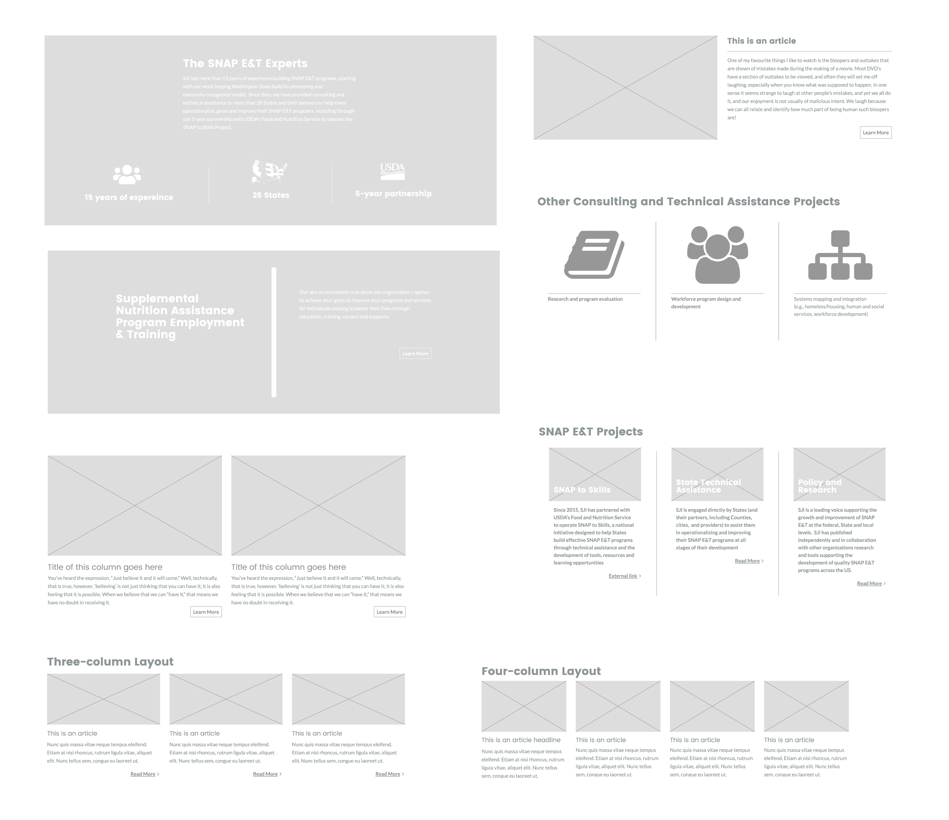 After putting together the wireframes and going through the approval process. It became clear that I would need to come up with a structured plan of how I would build everything. Much of the content needed to go through more editing and some had not been completed. I would need flexibility in how SJI would add and edit their content without me. It became evident that thinking more in terms of creating the 'building blocks' that could be re-used in multiple pages rather than build one page at a time.